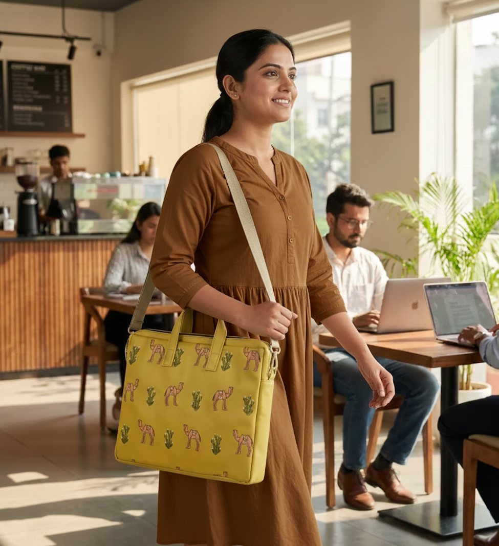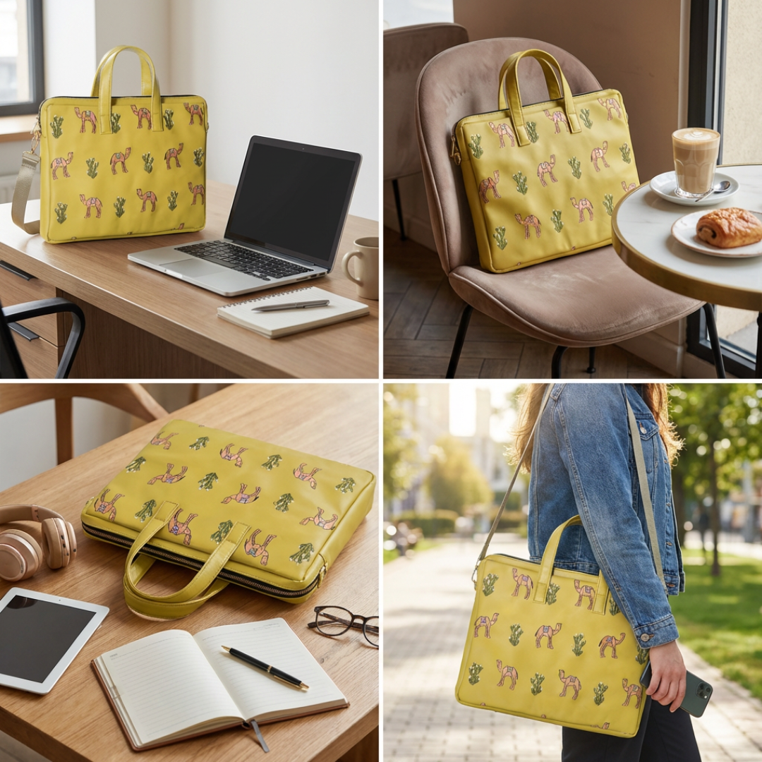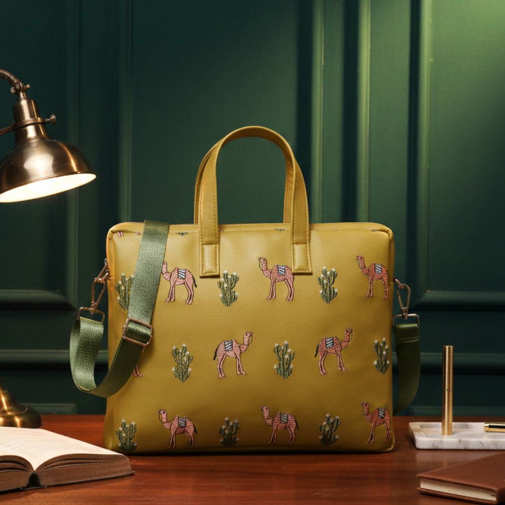 Stay stylish and organized on the go with Fusionkaari's Desert Harmony Laptop Bag. Perfect for the modern professional or student, this bag combines fashion and functionality seamlessly. The padded interior provides ultimate protection for your laptop, while the camel print exterior adds a touch of sophistication to your look. Whether you're commuting to work or heading to class, this versatile bag keeps you prepared and on-trend.