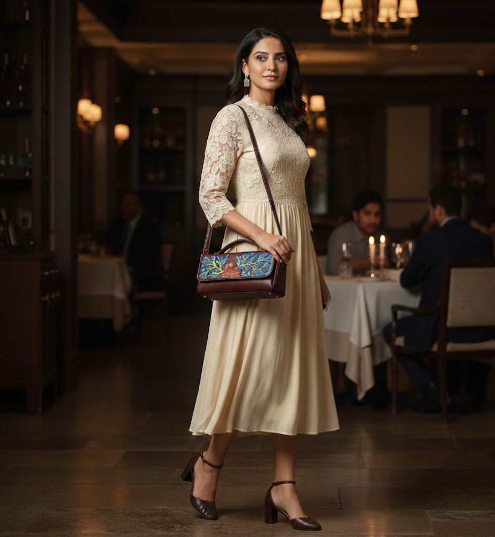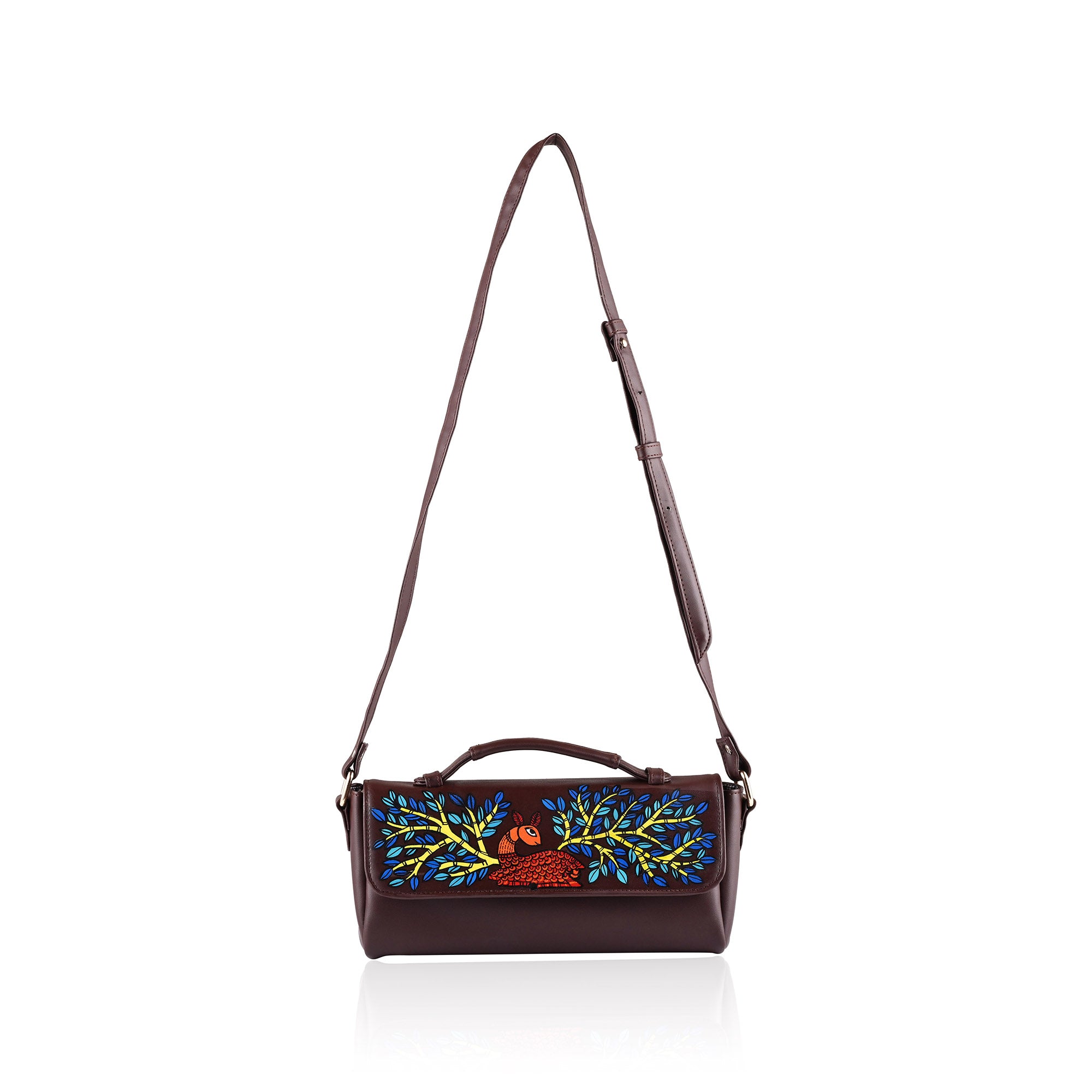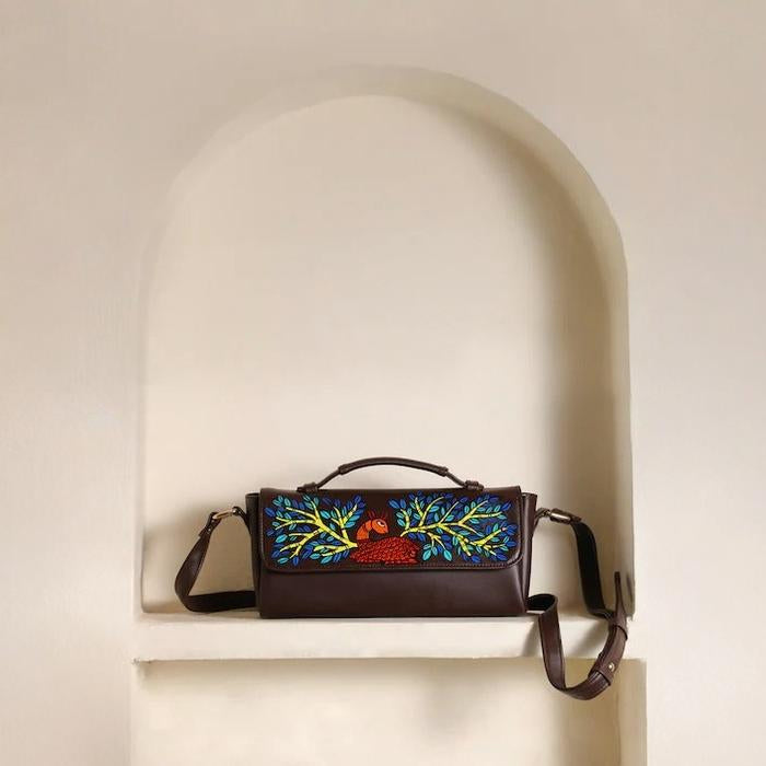 The warm brown base complements the colorful folk motifs, while its structured silhouette and flap-over style add a touch of modern sophistication. Perfect for casual outings, parties, dinners, or festive occasions, this sling celebrates art, tradition, and individuality in every detail.