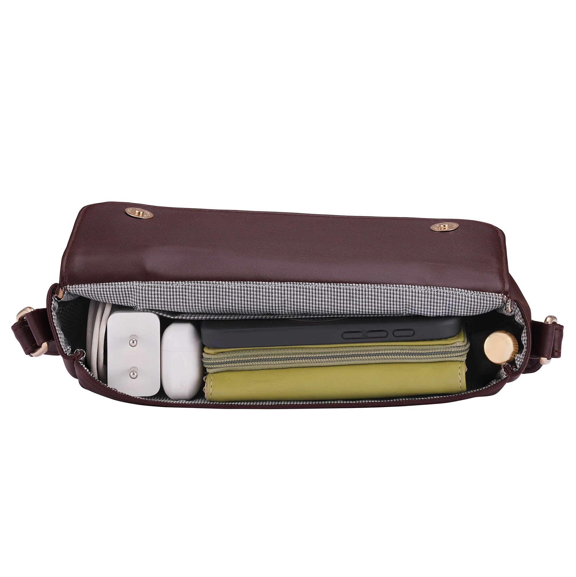 - Shape: Rectangular sling with structured flap-over silhouette